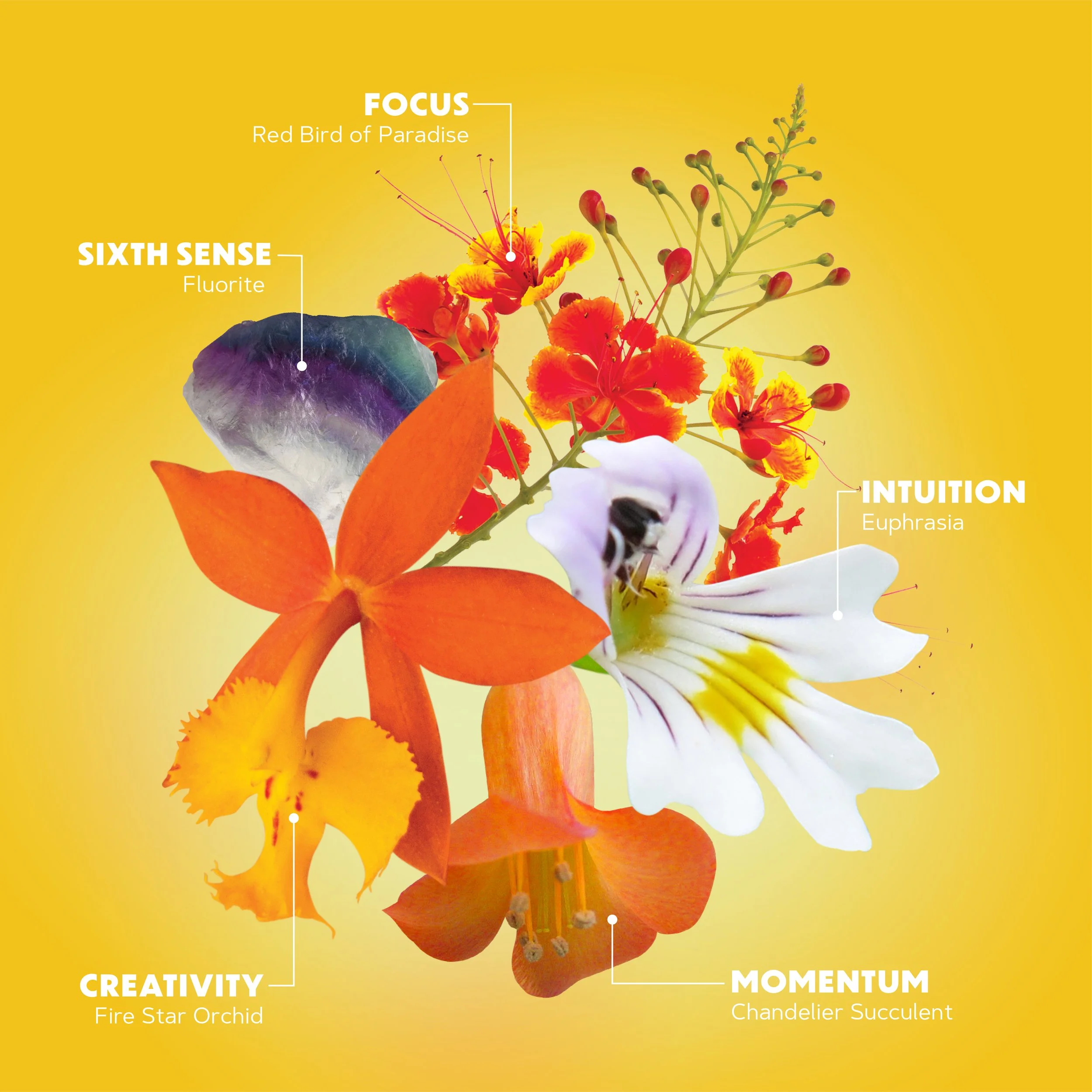 Purified water (Aqua), Citrus aurantifolia (Lime) Oil, Elettaria cardamomum (Cardamom) Oil, Citrus Limon (Lemon) Oil, Schinus molle (Pink Pepper) Oil, Pimenta racemosa (Bay Rum) Oil, Pimenta dioica (Allspice) Oil, Epidendrum radicans (Fire Star Orchid) flower essence, Caesalpinia pulcherrima (Red Bird of Paradise) flower essence, Kalanchoe tubiflora (Chandelier Succulent) flower essence, Euphrasia nemorosa (Euphrasia) flower essence, Achillea millefolium (Yarrow) flower essence, Nelumbo nucifera (Lotus) flower essence and Fluorite gem essence.
